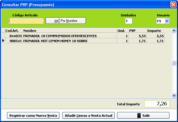 Situado en el Punto de Venta de Etron Farmacia, para obtener la ventana de Consulta / Presupuestos