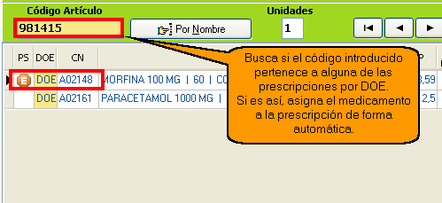 Castilla y León - Ahora, desde la casilla de Código Artículo se puede leer o introducir a mano el Código Nacional, tanto para las prescripciones por marca como por DOE. Etron localizará la dispensación por marca o por DOE al que pertenece el código introducido y si existe la prescripción lo asignará automáticamente.