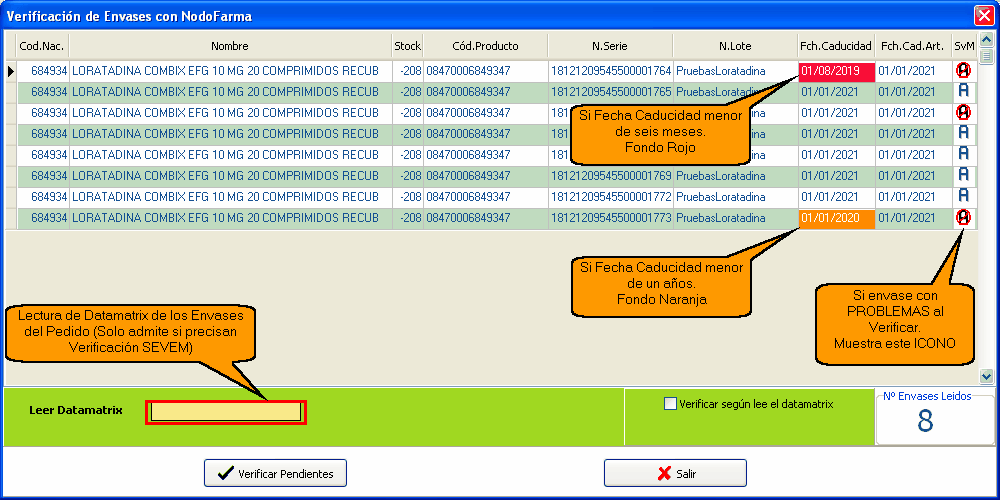 Al pulsar el botón "Verificar SEVEM", se abre una ventana donde podemos leer los datamatrix. Se pueden leer todos seguidos y al finalizar pulsar el botón "Verificar Pendientes". También se pueden dejar sin verificar y hacerlo más tarde desde cualquier ordenador.